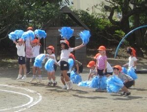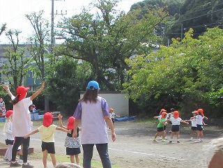 お兄さん、お姉さんたちの色違いのポンポンに囲まれて、年少、年中児はニコニコになってジャンプしたりポーズを楽しんだりしました。