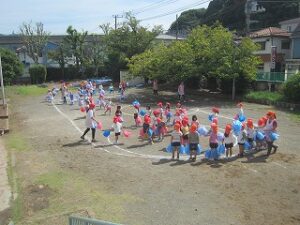 年長児は、運動会に向けて友達と踊りや競技のお手伝い等、自分たちで考えて進めていくことを楽しんでいます。他学年がいるるんから手紙やプレゼントをもらっていることをずっと気にした年長児、いるるんに手紙を書いたり、探したり…していたところ…なんと今日、いるるんから手紙とプレゼントが届いたのです。大喜びで満3歳、年少、年中組の友達に知らせに行きました!