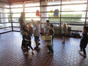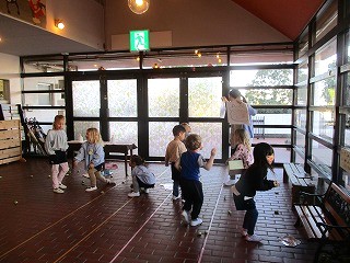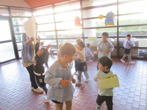 各クラスで節分についてお話をしています。玄関の広いスペースには、先週から手作りの豆が置いてあります。鬼をめがけて「えいっ!」「鬼はそと!」子どもたちの元気いっぱいの声が響いています。いろいろな学年の子どもたちが集まってきて、一緒に楽しい時間を過ごしています。