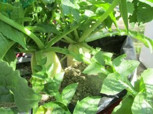 土の中からダイコンが顔を出してきました。年中組の子どもたちが育てているダイコンが大きくなり、収穫の時期が近づいてきています。他学年の子どもたちも興味をもってよく見ています。