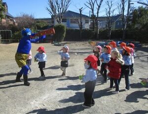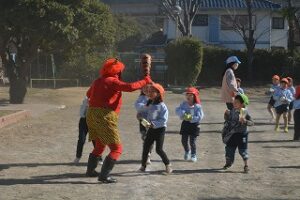今日は節分、幼稚園では全園児で豆まきをしました。園庭に集まった子どもたち、「お腹の中にどんな鬼がいるかな?」「みんなで退治しよう!」と豆まきが始まりました。先生鬼を追いかけて「鬼はそと~!」と元気いっぱいの子どもたちのもとに大きな鬼がやってきました。