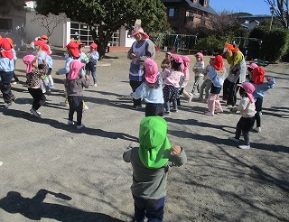 赤鬼と青鬼が現れ、子どもたちは驚いたり、動きが止まったり…年長児が大きな声とともに豆を投げつける姿を見て、他学年の子どもたちも動き出しました。「鬼はそと!!」「福はうち!!」一生懸命に声を出す子どもたち、たくさんの豆が当たった鬼たちは幼稚園から逃げていきました。