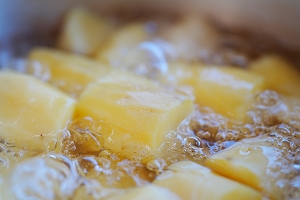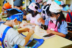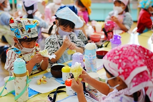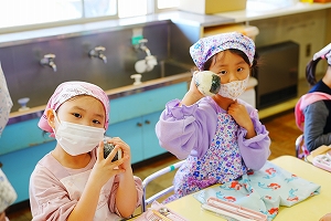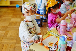 さて、年長さんはスペシャルな一日でした。春、田植えをし収穫したお米で『おにぎりパーティー』&『お芋パフェ』づくりをしました。芋掘り遠足で収穫したお芋は、べにはるかという品種です。職員室で茹でて、一人一人に仕分けていきました。