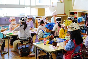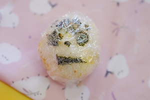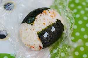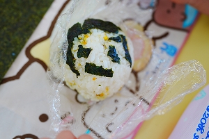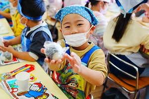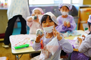 まずはおにぎりづくりです💛こどもたちが田植え→稲刈り→脱穀→籾摺りをしたお米は、カップ一杯ほどでした。今夏の猛暑と雨が降らなかったことが影響しての収穫です。先生から実際のお米の量を見せてもらい「これじゃあ、おにぎりひとり分じゃないの・・・。」と心配そうな子どもたちでした。(そこで、少しお米を足しています。)日頃食べているご飯のありがたさを感じたのではないでしょうか。炊き立てのご飯をおわんに入れてもらい、自分の好きなふりかけを選び、混ぜていきました。ラップの上にご飯をおいて、くるんで握っていきました。