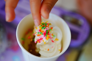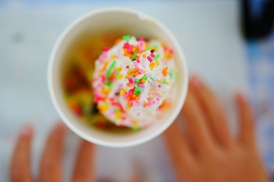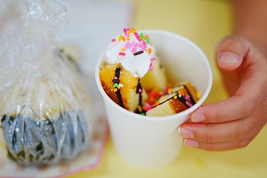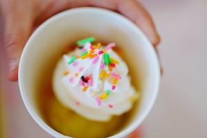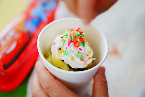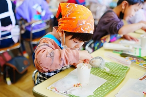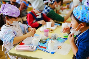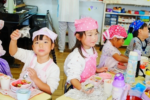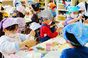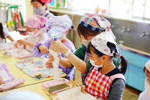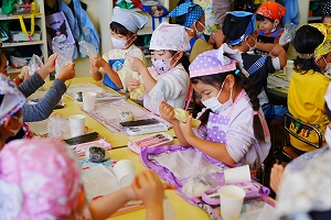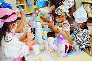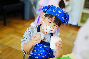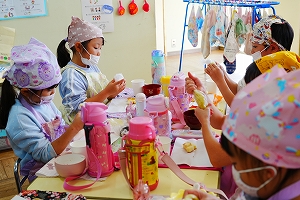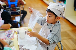 次は『お芋パフェ』です。袋の中に入ったさつまいもをよく潰していき、牛乳を加えていきました。混ざると、丸くしていきます。カップの中にスポンジ生地を入れ、その上にサツマイモ、生クリーム、チョコスプレーなどを自由にかけていきました。年長さんの心が弾む様子が伝わってきました。