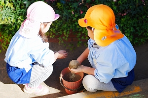 こっぱ村広場の桜が紅葉し、とても美しいです。今日は暖かい一日でした。ぽかぽかの日差しを感じながら、のびのびと戸外遊びを楽しみました。まるで、職人さんのように泥団子づくりをしていた年中さん。網で振るった白砂を仕上げにかけていました。