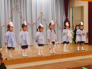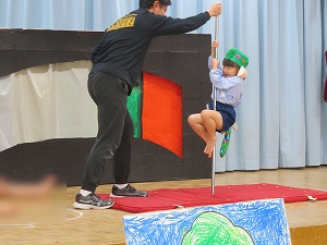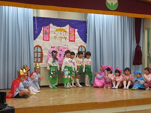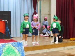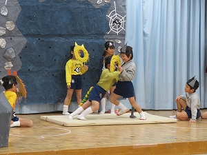 日常の遊びや活動から楽しんできた手遊び、リズム、わらべうた、運動遊び、ふれあい等を盛り込んで子どもたちが遊びの延長線上でのびのび表現する会です。年長さんはこれまでの経験を生かし、おはなしづくりから始まり、自分たちで動きやセリフを考え、身に着けるものや大道具も手作りしました。たくさんの思いがつまった劇遊びです。