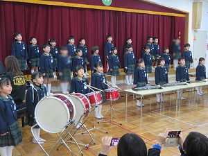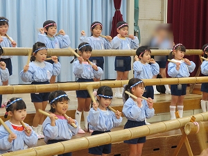 2部制で実施しました。年中さんの竹太鼓、年長さんの合奏はクラスの友達と気持ちを合わせ、素敵な音色でした。