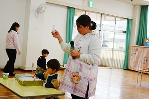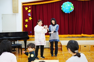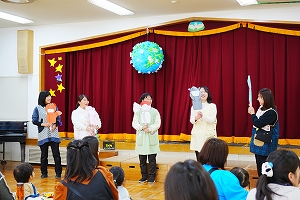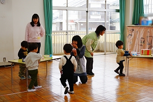 今日は未就園児『ニコニコクラブ』を実施しました。たくさんのニコニコさんが遊びにきてくれて、嬉しかったです。大型ペープサート『コンコンくしゃん』を楽しみました。いろいろな動物が風邪をひいて、マスクをする歌です。風邪には気を付けてください。