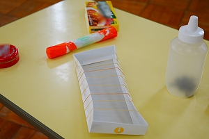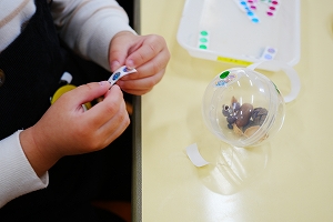 今日の活動は「音で遊ぼう♬」でした。様々な木の実が入ったカプセルに、自由にテープを貼りオリジナルの楽器を作りました。シャカシャカ♪音色を楽しみます。