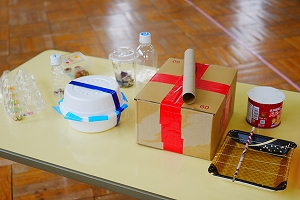 各コーナーでは、身近な素材で音を出せるコーナーがあり、ニコニコさんは思い思いに鳴らしました。