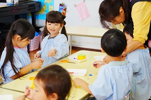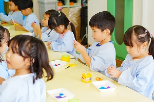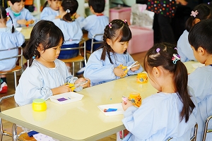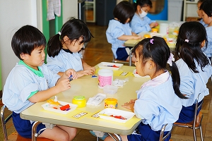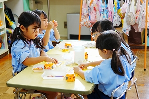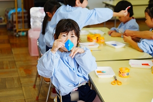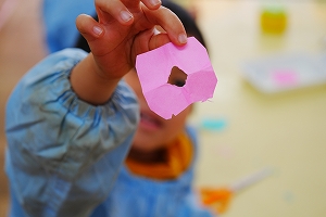 さて、年中さんは七五三の袋製作をしました。小さなサイズの折り紙を自分たちで切り紙にして、お花を作りました。先生の話をよく聞いて取り組む姿勢が素敵でした。