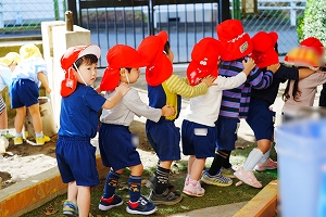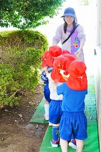 いちご組さんが体操広場に移動する時に、友達と一本の電車になっていた様子に感心しました。いちごさんも友達と仲良く過ごしています。