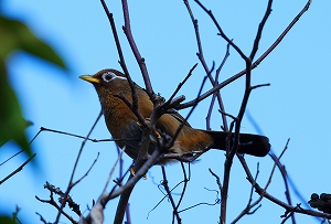 朝から美声を震わせていたのは外来種のガビチョウです。大音量で他の鳥の鳴き声を真似ます。普段は声は聞こえど姿は見えぬ鳥ですが、今朝は体操広場で確認できました。