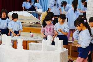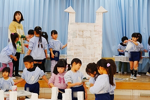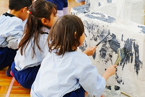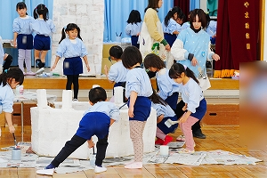 さて、共同制作「宇宙」完成に向けて、毎日着々と取り組んでいる子どもたちです。ホールでは年長さんが合同で、役割分担をしながら進めています。