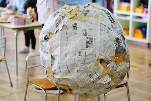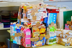 空き箱や新聞紙などの廃材があっと言う間に形になっていきます。子どもたちの発想には驚かされています。