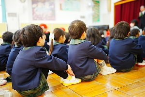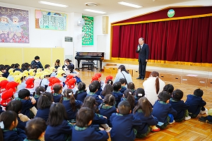 戸外で思い切り遊んだ後は、ホールに全クラス集まって始業式を行いました。今日からいちご組さんに入園したお友達も一緒に参加できました。園長から3学期の過ごし方や創立50周年の話を聞き、とても立派な態度でした。