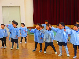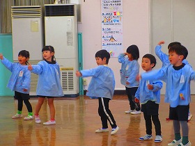 運動会で年長が踊った踊りが大好きになりました。年長のカッコよさに憧れて、年長のように自分たちでカッコよく踊りました。