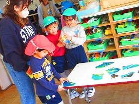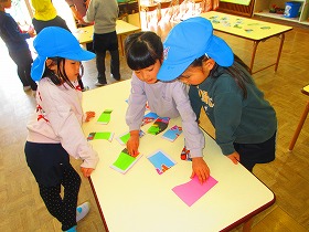 今日は年中と年長が2人または3人のチームになっていろいろな遊びのコーナーを楽しむ