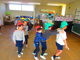 じゃんけん列車♫しゅっしゅっしゅー♬の歌に合わせて歩きます。