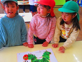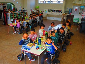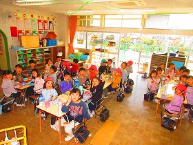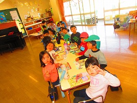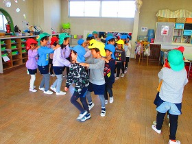 園生活の中で異年齢交流を深めてきた年中と年長が集まると仲良しパワーを感じます。