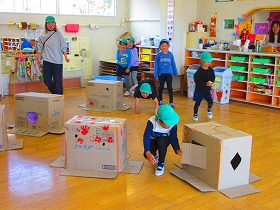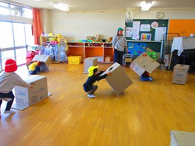 段ボールに隠れた同じチームの友達を探します。
