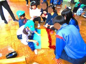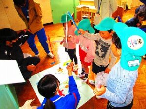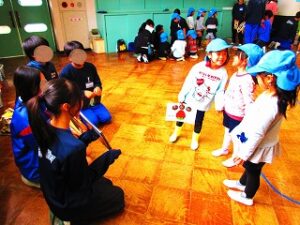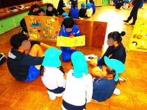 幼稚園に遊びに来て、手作りの遊具や絵本の読み聞かせを