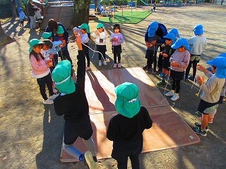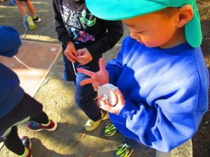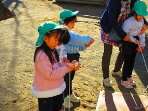 丁寧に紐をまき、回せる友達からやり方をレクチャーして