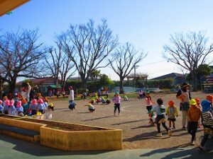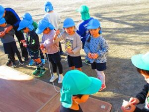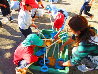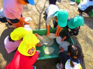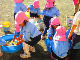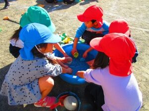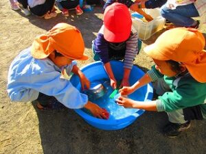 全学年の子ども達が、園庭でおもちゃを洗い始めました。