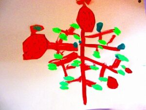 色紙をハサミを使って連続切りを行い、紙皿に貼り付けて