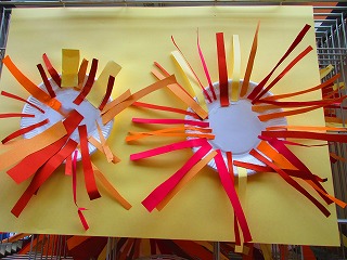 色紙をハサミを使って連続切りを行い、紙皿に貼り付けて