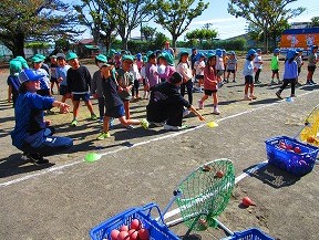 年長児には、やわらかい球を使用して、球の投げ方やバット