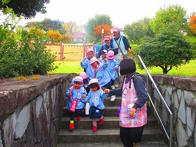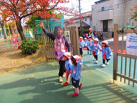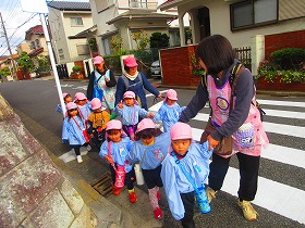 先生やお友達と手を繋いで一緒に歩いて行きました。