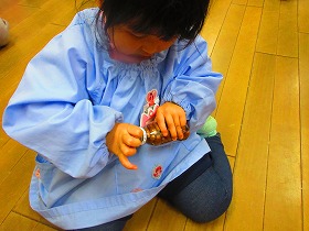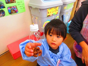 幼稚園に帰ってから、お土産に持ち帰ったドングリを容器に入れて、マラカスを作りました。