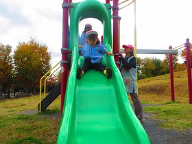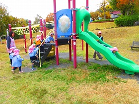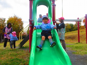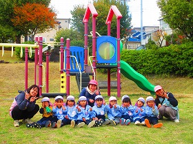 公園についてクラス写真を撮りました。にっこり笑って『ハイ!ポーズ!』ステキな写真が撮れました。写真撮影後は、公園の滑り台が気に入って、繰り返し楽しそうに滑っていました。
