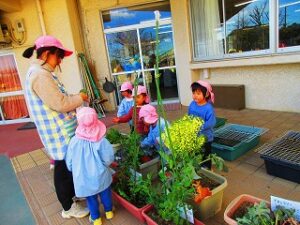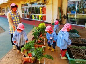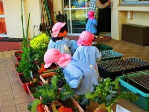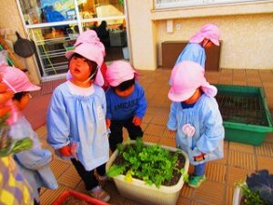満3歳児のたまご組さんが、先生と一緒にプランターで育てている