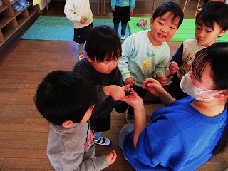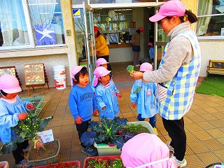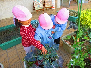 満3歳児のたまご組さんが、先生と一緒にプランターで育てている