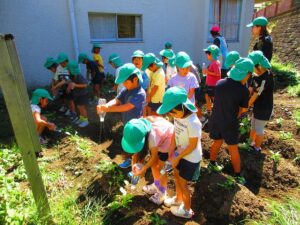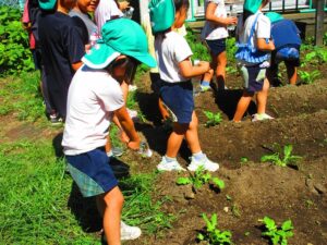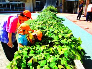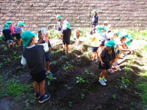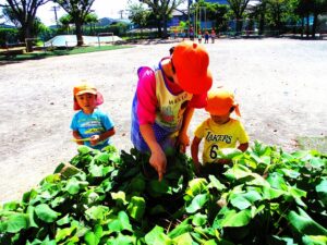 年少組さんが、育てているサツマイモや園庭に落ちている