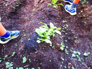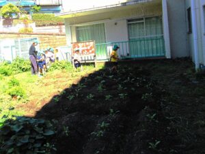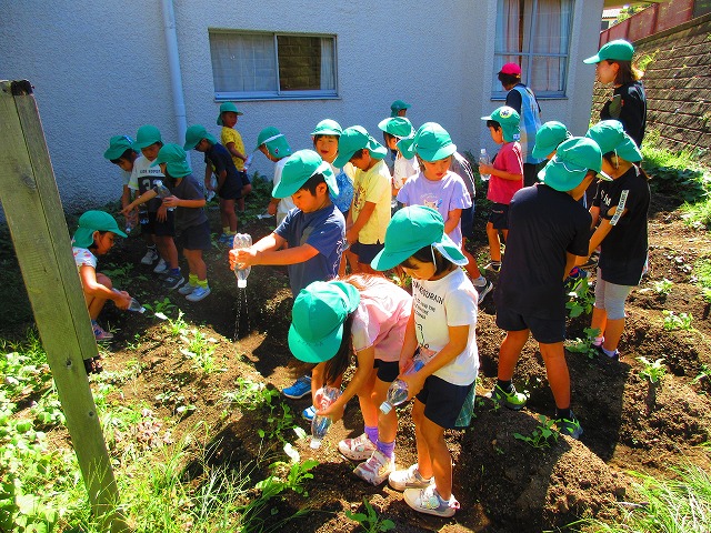 水をやろうと、園舎裏にある「みんなの畑」にやってきました。