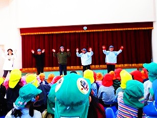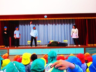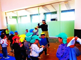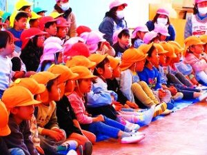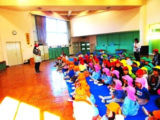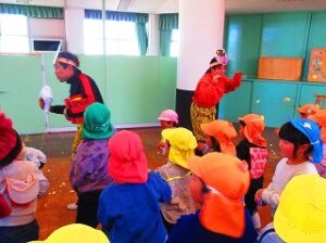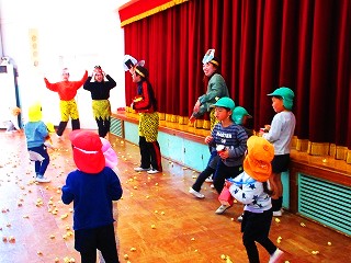 2月3日の午後に、全学年の園児がホールに集まり、