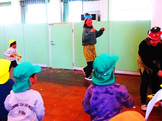 子ども達豆を投げるふりをしました。
