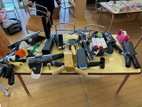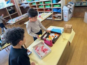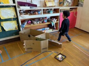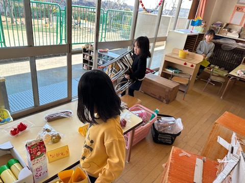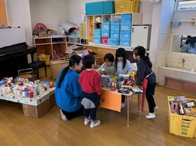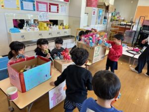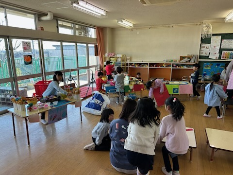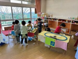 年中組のお店づくりが進み、うさぎ組では年少のお客さんが