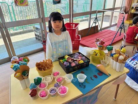 あひる組では、作り上げたお店で売り買いを楽しむ姿や、