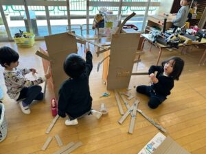 でき上がりをイメージして、友達と懸命に取り組む姿が